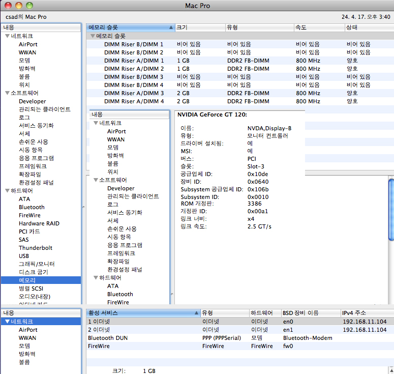 맥프로 3.2 쿼드 하드650G 메모리6G 그래픽GT120